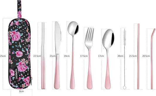 Travel Utensils,Reusable Silverware Set to Go Portable Cutlery Set with a Waterproof Carrying Case for Lunch Boxes Workplace Camping School Picnic (Browngridcase/Rosegold)